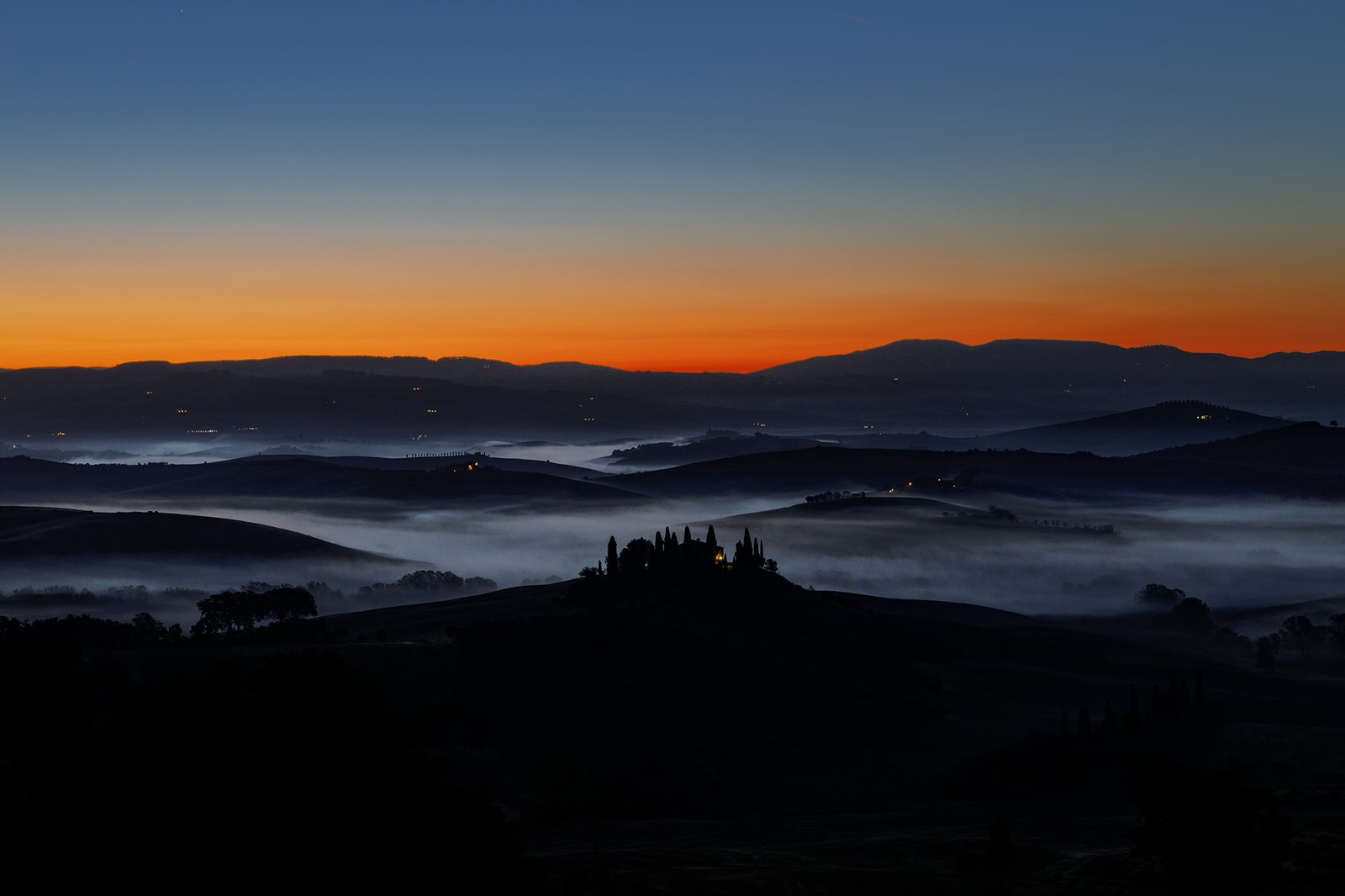 Tuscany is famous for its rolling hills dotted with cypress trees lining the hilltops and leading up to the classic red-roofed farmhouses. The landscape is often interspersed with layers of mist leading off to distant mountains, especially at sunrise.